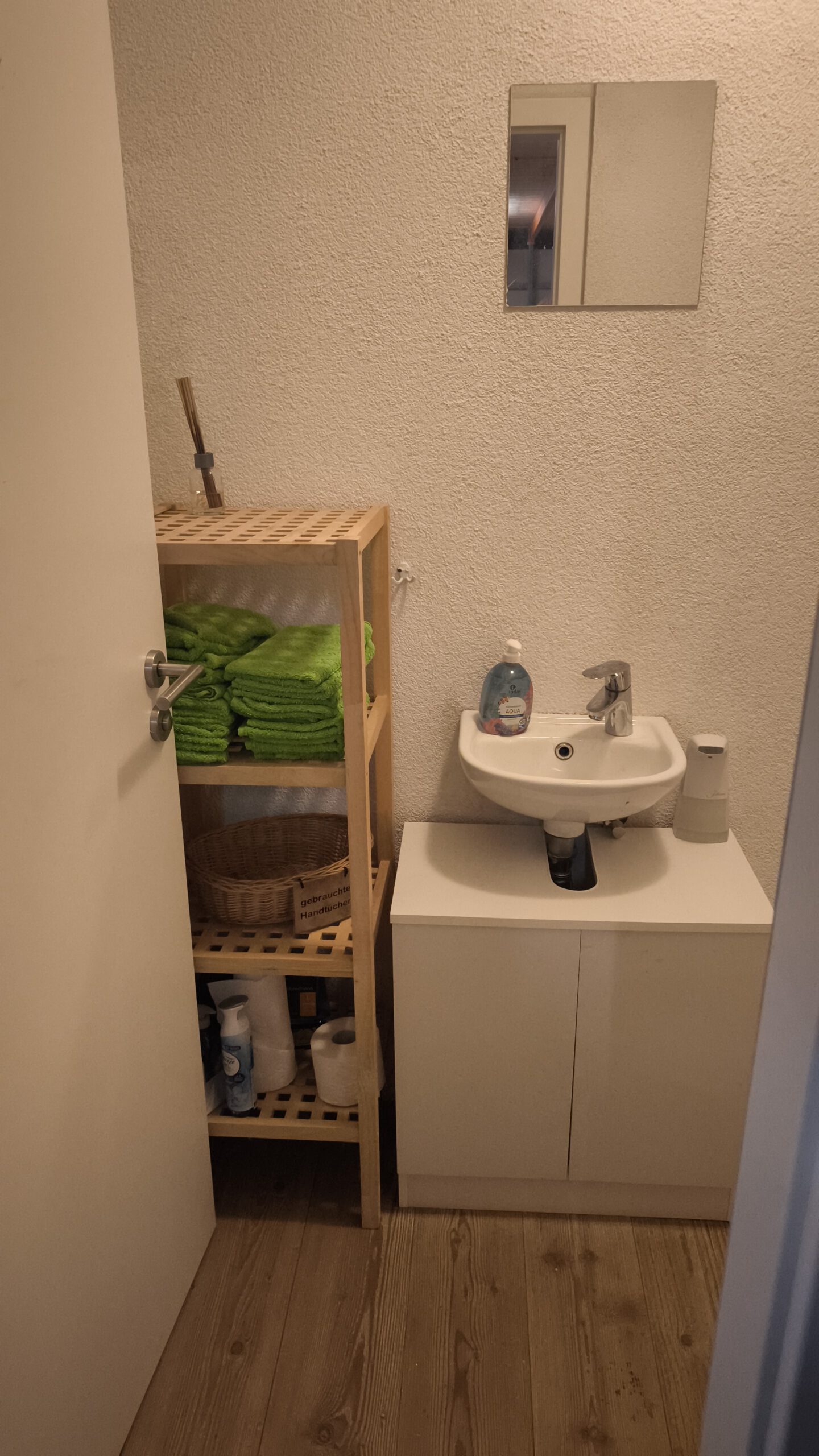 Dier ersten 20 Stunden sind geschafft, 90% vom Boden sind fertig und die zukünftige Toilette ist schon einmal etwas wohnlicher geworden, wenn auch nur vorübergehend, denn auch hier gibt es einen neuen Boden und einen frischen Anstrich.